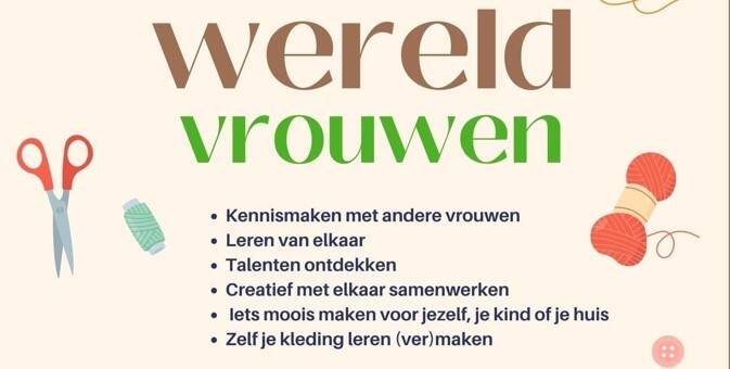 Op woensdag 25 oktober 2023 tussen 09.30 en 11.30 uur. Bijeenkomst van wereldvrouwen. Elkaar ontmoeten, kleding (ver)maken. Deelname kost € 1,-