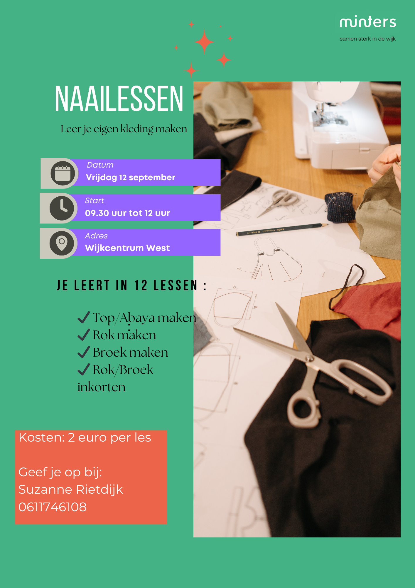 Op 12 september 2025 is er een nieuwe cursus naailessen gestart. Op de vrijdag tussen 09.30 en 12.00 uur nemen we jullie mee in allerlei handige naaiactiviteiten. Denk aan top/abaya maken, rok-, broek maken en bijvoorbeeld een rok of broek inkorten. De kosten zijn 2 EURO per les. Opgeven bij Suzanne Rietdijk in persoon of per telefoon 06-11746108.