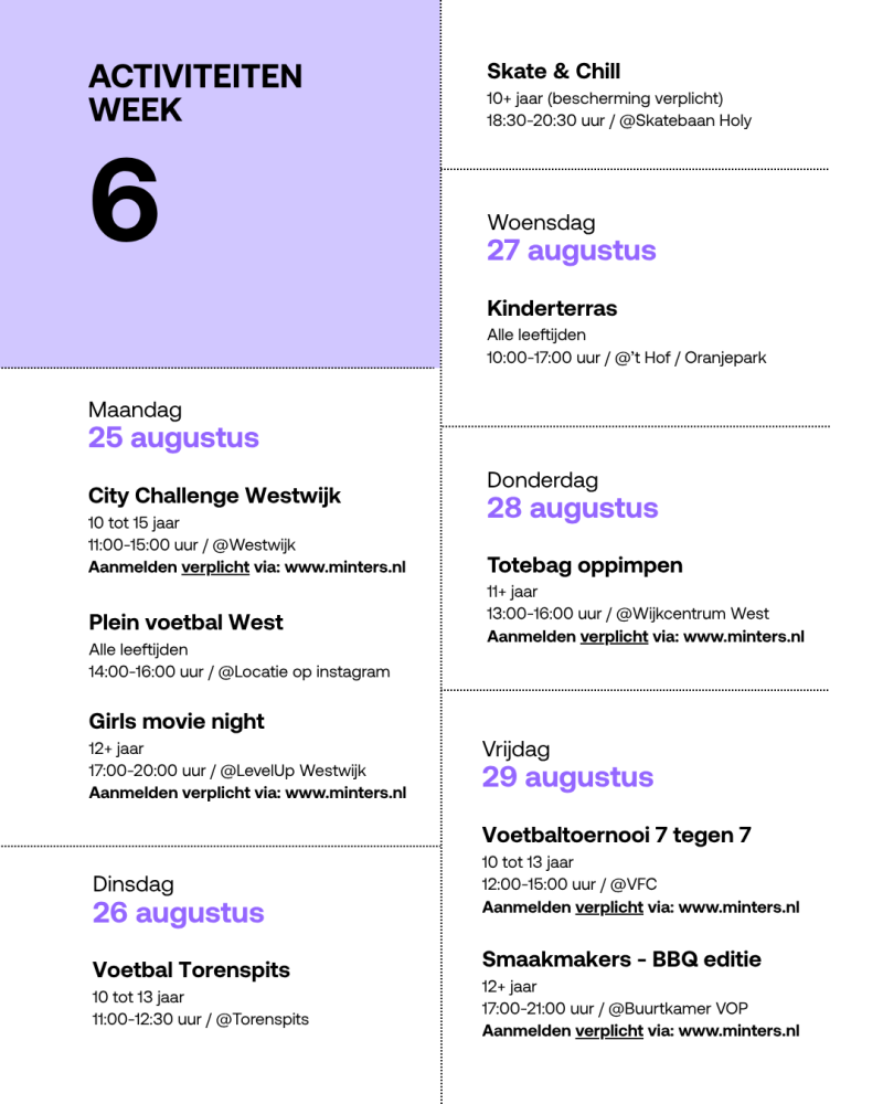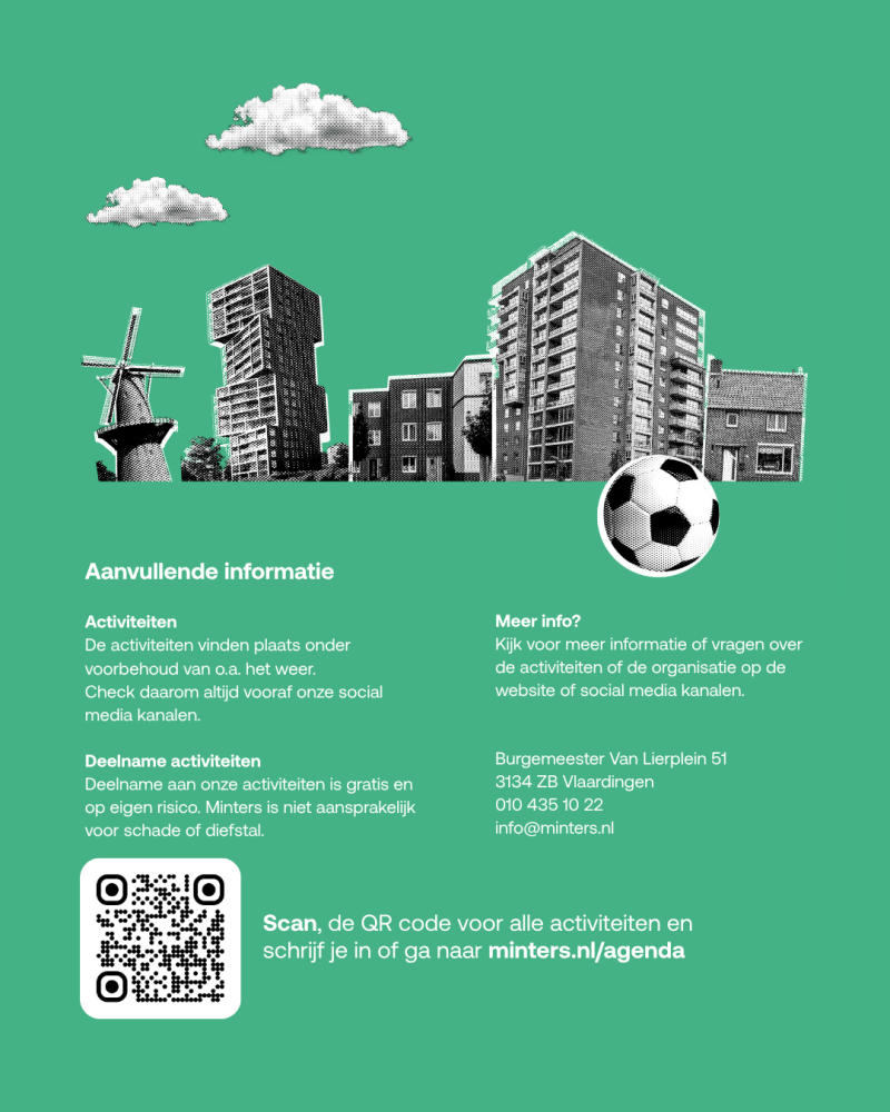 In dit programmaboekje vind je per dag de activiteiten die in Vlaardingen door het jongerenwerk van Minters worden georganiseerd. Deelname is gratis, tenzij anders vermeld. Wij zijn te vinden op pleinen, in straten, gymzalen, buurthuizen, winkelcentra, speeltuinen, en... Kortom: bijna overal in Vlaardingen.