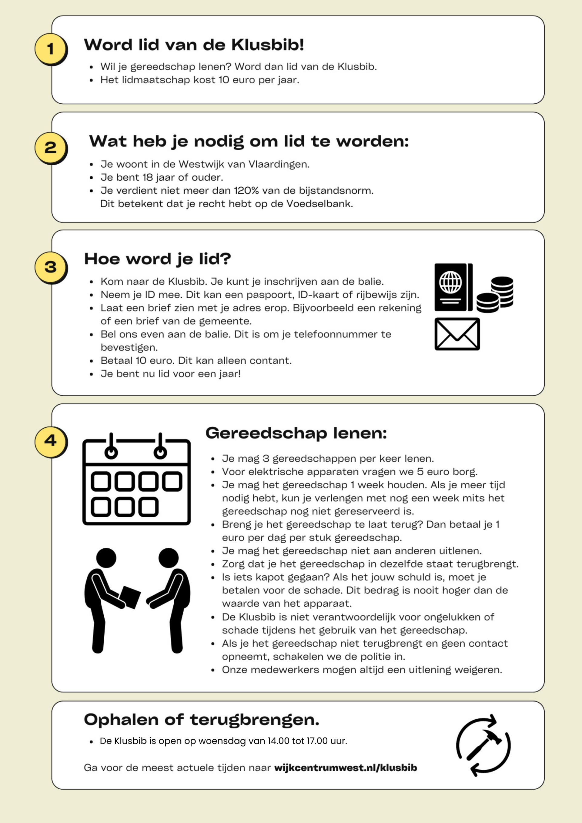 OPENINGSTIJDEN: De Klusbib is elke woensdagmiddag open van 14:00 tot 17:00 uur voor inschrijvingen en het lenen van materialen. Ook geopend op de 1e zaterdag van de maand tussen 09.30 en 12.00 uur. Sinds januari is de Klusbib ook geopend op maandagen van 13.00 tot 16.00 uur.